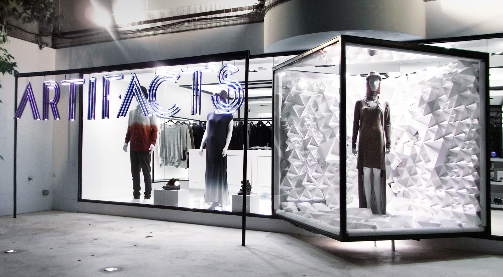 秋冬櫥窗「紙,結晶。」發想源自於ARTIFACTS logo,利用三種等比尺寸的三角幾何體,透過錯綜排列,再以觀看者的視覺神經為主體,移動身體、調整角度,不同的視覺效果由是而出。